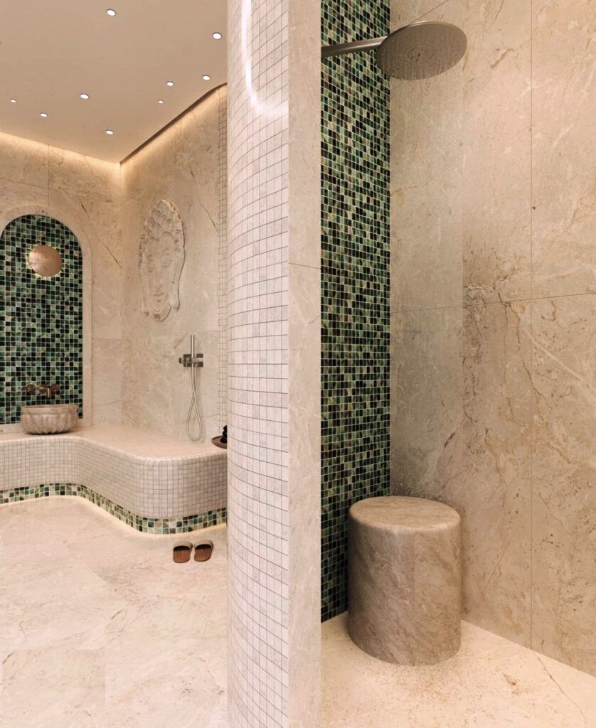 Notre Hammam My 7 Diamonds Hammam & Spa fonctionnne avec  des éléments chauffants  qui sont intégrés  dans les murs et  le sol de notre Hammam pour chauffer les surfaces, il est aussi equipe d’un générateur de vapeur qui produit à la fois de la chaleur et de la vapeur qui est ensuite diffusée dans le Hammam et qui permet un contrôle precis de la temperature